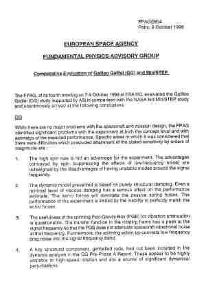 EVALUATION of GG GG has been evaluated by the Fundamental Physics Advisory Group (FPAG) of ESA on October 7 1996. The FPAG had at its disposal the GG Pre-Phase A Report (ASI 1996) prepared by the GG Team, and a "Technical Assessment of the GALILEO GALILEI (GG) Experiment" prepared at ESTEC by J.W. Cornelisse (on the GG spacecraft) and by Y. Jafry & M. Weinberger (on dissipation and active control in GG). The technical work carried out by Jafry and Weinberger was supervised by an FPAG member (S. Vitale). The Recommendation of the FPAG is given below. The FPAG members at the